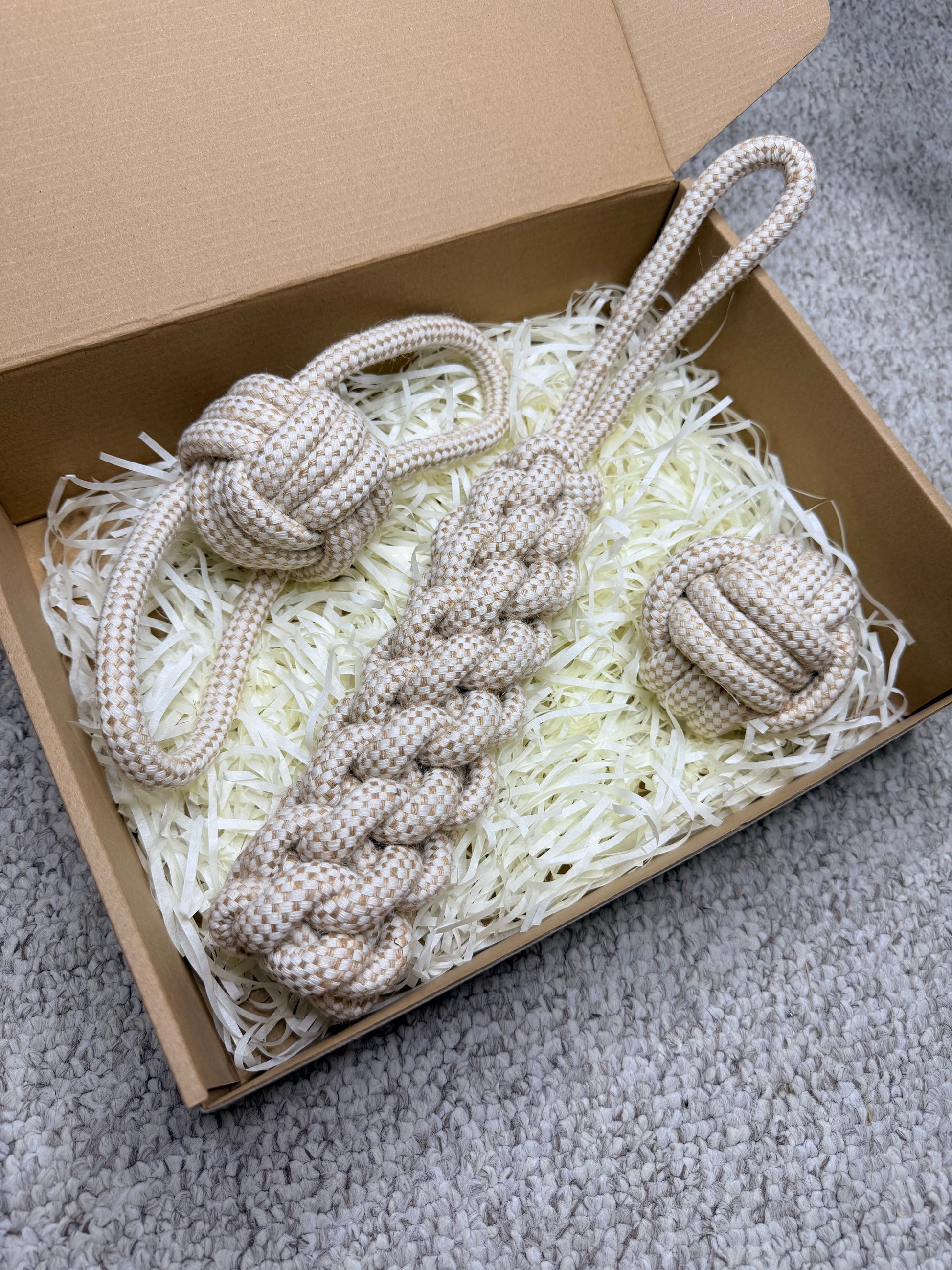 Treat your dog to hours of interactive fun with this Natural Rope Dog Toy Set, crafted from tough, tightly woven cotton rope in calming, neutral tones. This three-piece set includes a solid knotted ball for chewing, a chunky braided ring for tossing and gentle tug, and a wrapped rope tug with a comfortable loop handle for interactive play and training.